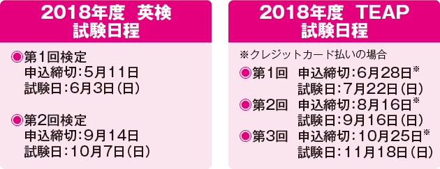 高校3年生の皆さんは、来年1月の一般入試出願までに英検ではあと2回、TEAPではあと3回の受験チャンスがある。今から計画的に勉強をスタートして、志望校受験に必要な、目標の級・スコア取得をめざそう。
