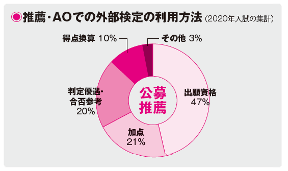 前回の入試(2020年度)の推薦・AO(21年から学校推薦型選抜・総合型選抜)では、全759大学中354大学(47%)が何らかの方式で外部検定を利用した。2021年度入試ではさらに増加する模様だ。