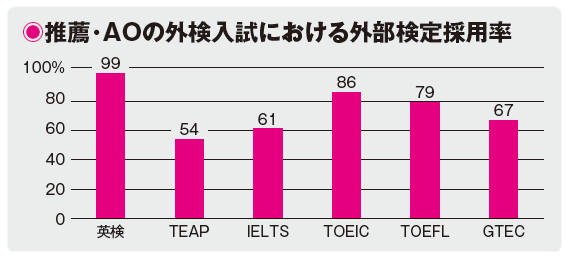 このグラフは、推薦・AOで外部検定を利用した大学が、どの外部検定を採用したかを集計したものだ。すべての外部検定の中でも圧倒的な採用率を誇るのが英検。英検を取得しておけば、ほとんどの外検入試に利用できるといってもよいだろう。