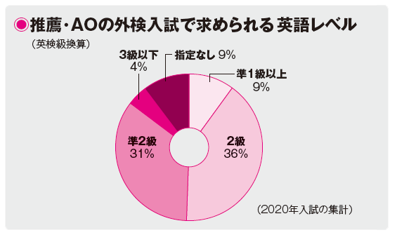 このグラフは、推薦・AOの外検入試で大学が求めた英語レベルを集計し、英検級に換算したものだ。大学が受験生に求めたレベルは、国際基準「CEFR」のA2~B1、つまり英検準2級(高校中級程度)と2級(高校卒業程度)で7割近くを占める。推薦型・総合型で外検入試を受験する場合には、このレベルを目標としよう。