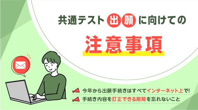 今年度の共通テストは、出願手続きで大きな変更があります。高3生はすでに学校や塾で説明があったとは思いますが、出願手続きの電子化に伴い、これまで高校がとりまとめてくれた出願手続きを、受験生個人で進めなければならなくなりました。