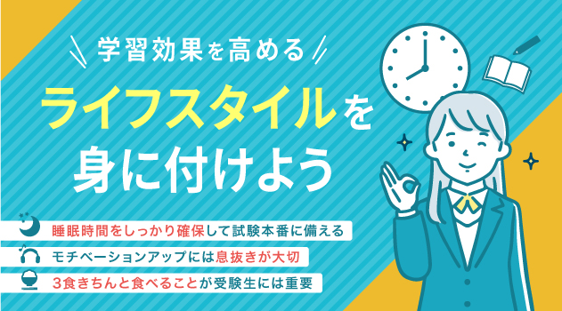 志望大学合格を目指すなら規則正しいライフスタイルと十分な睡眠時間、きちんとした3度の食事、そして適度な息抜きが大切です。さっそく今日からはじめてみてはいかがでしょうか?